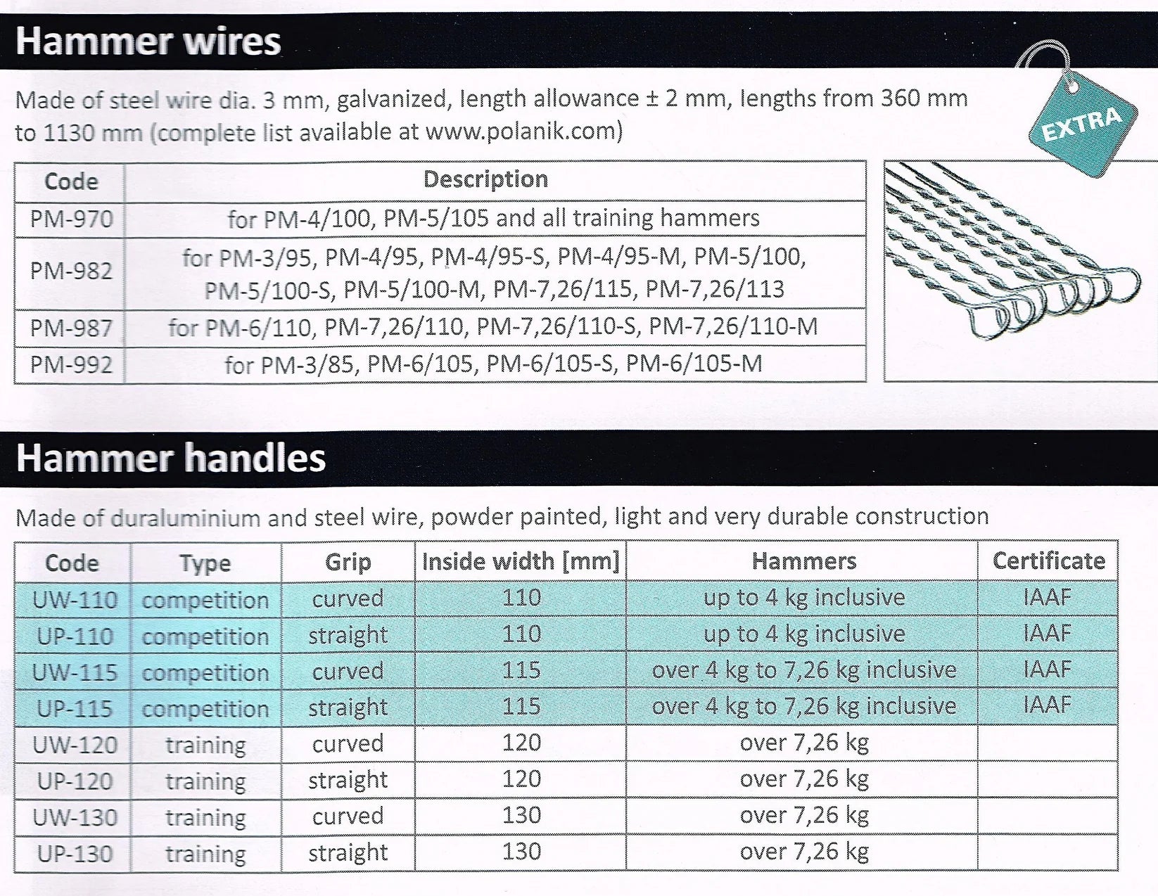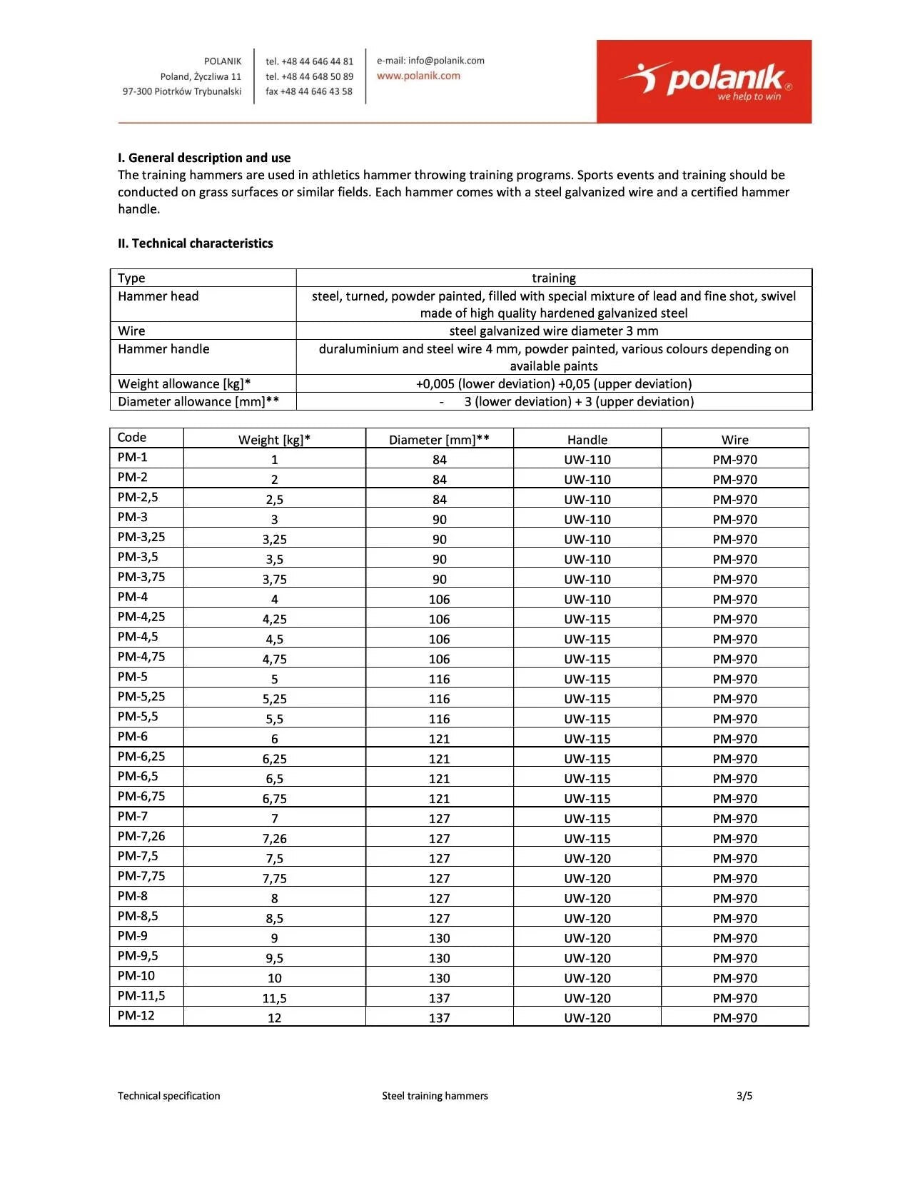 The Polanik Training Hammer is built for athletes refining their technique, offering durability for rigorous practice. Available in many different weights, including 3kg, 4kg, 5kg, 5.45k, 6kg, 7.26kg, and even heavier options for overweight training, it features a powder-coated steel head with a robust design. Includes a precision-finished galvanized adjustable steel wire with small loops for minimal stretch and a curved aluminum handle. Ideal for high school and club programs. The toughest hammer on the market.